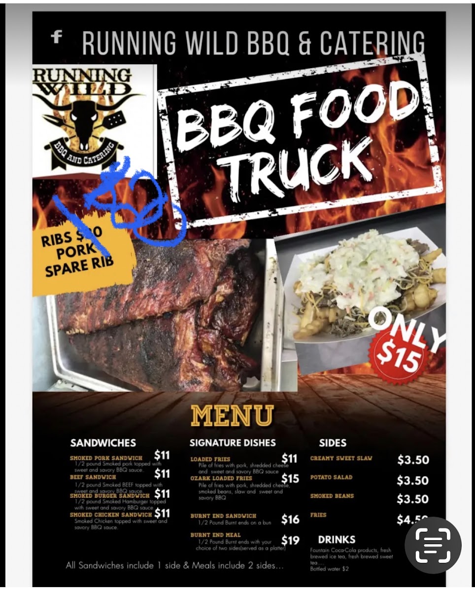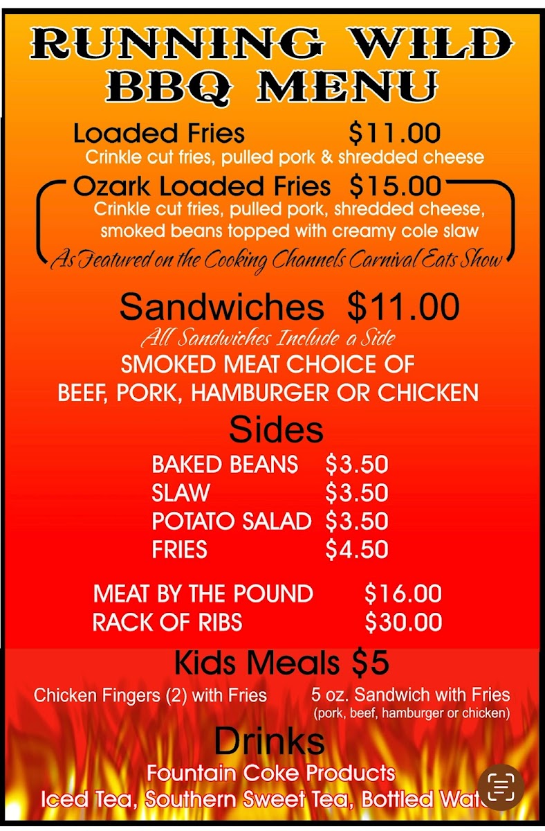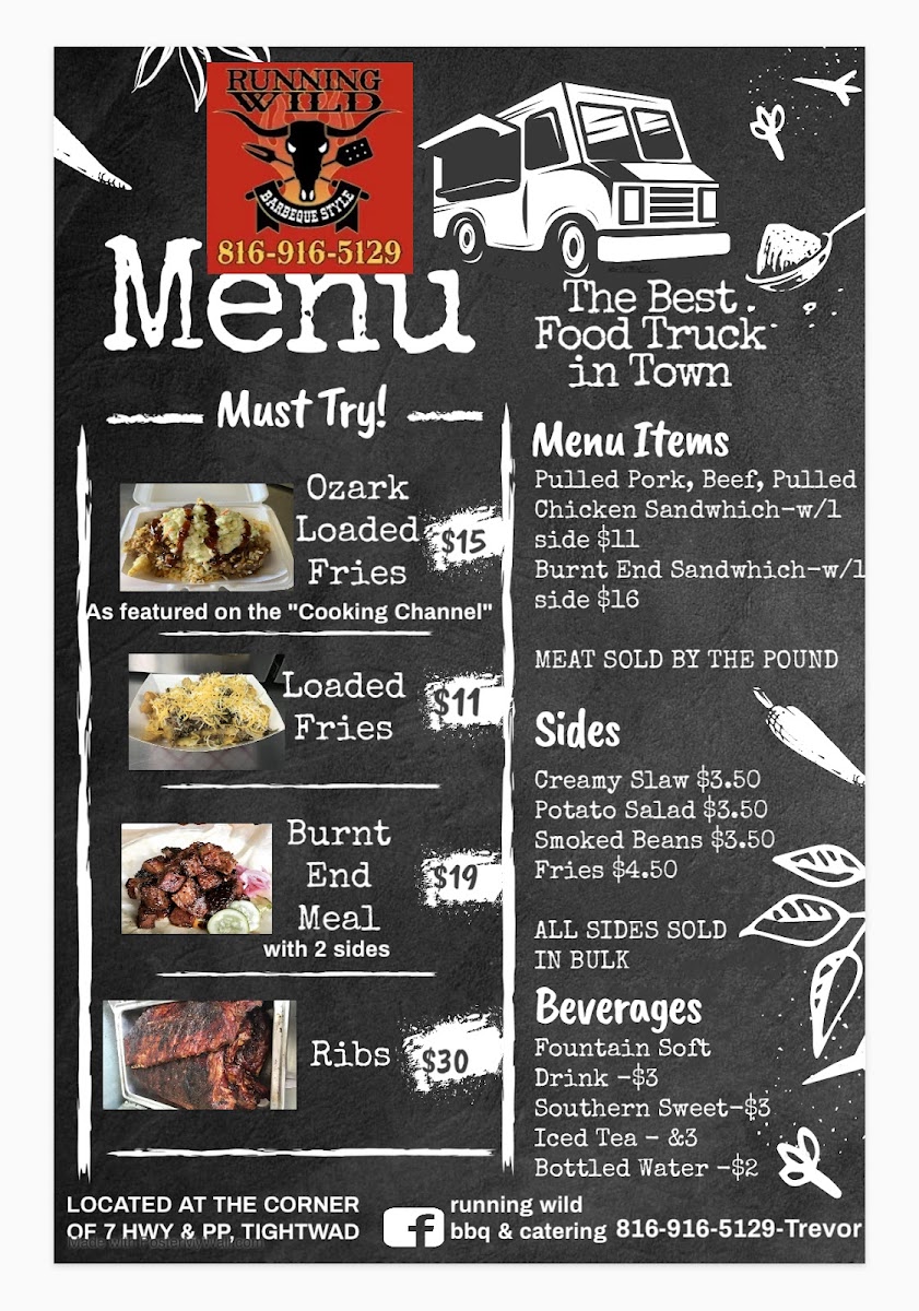 If you're craving some of the best BBQ in Tightwad, MO, look no further than the Running Wild Bbq Food Truck Menu. Located at 3443 SE Hwy PP, this food truck is serving up mouthwatering dishes that are packed with bold flavors. Whether you’re in the mood for tender smoked brisket, juicy pulled pork, or crispy chicken, you’ll find something to satisfy your hunger. Each item is cooked low and slow to bring out the best in the meats, and they’re paired with homemade sides that will have you coming back for more. From tangy coleslaw to savory baked beans, every bite is designed to complement the smoky goodness of the BBQ. It’s not just food; it’s a full experience - one that makes you feel like you’re part of the Running Wild BBQ family. So, if you’re nearby or just passing through, make sure to stop by and dive into a plate of BBQ goodness that will leave you craving more.